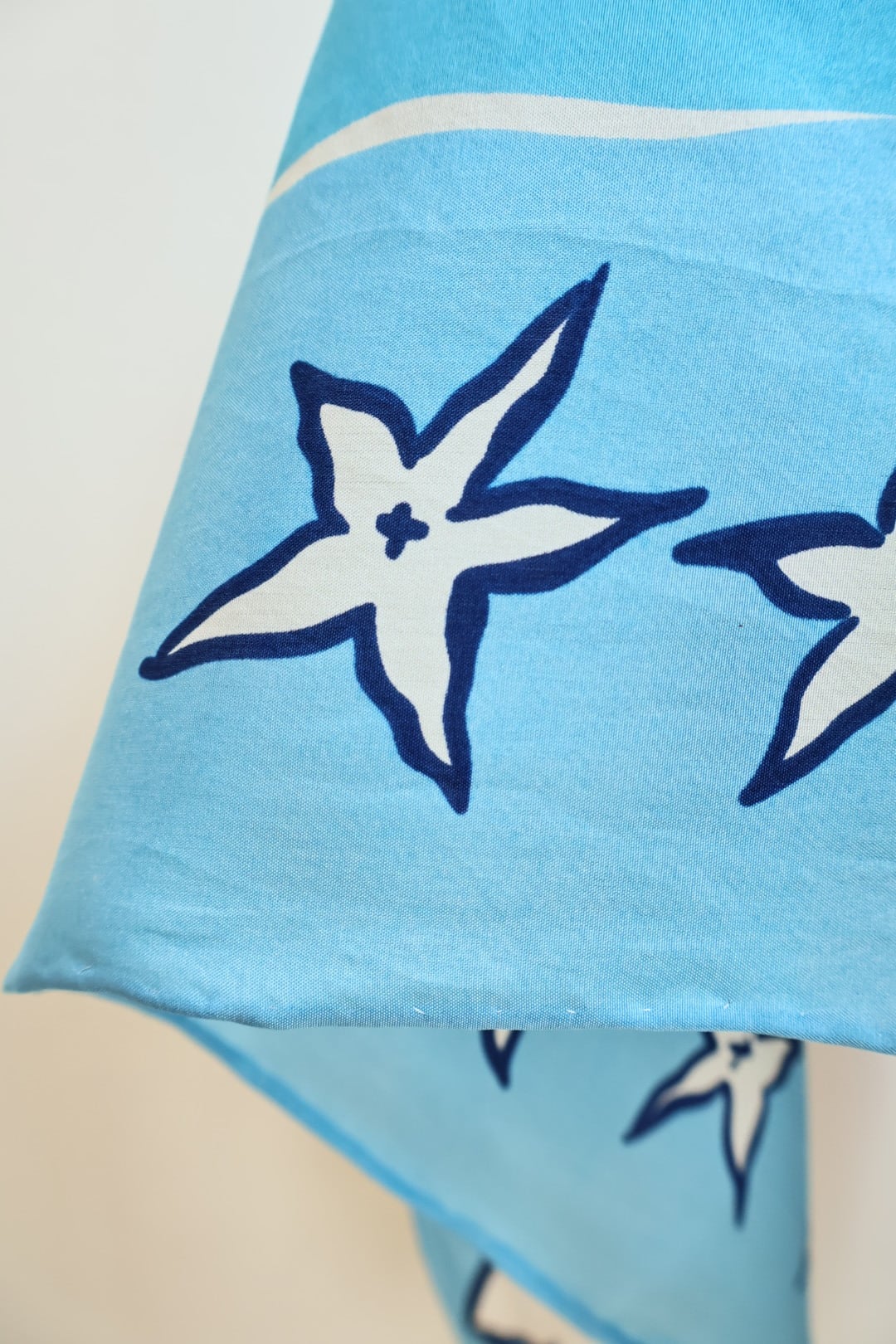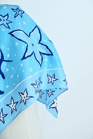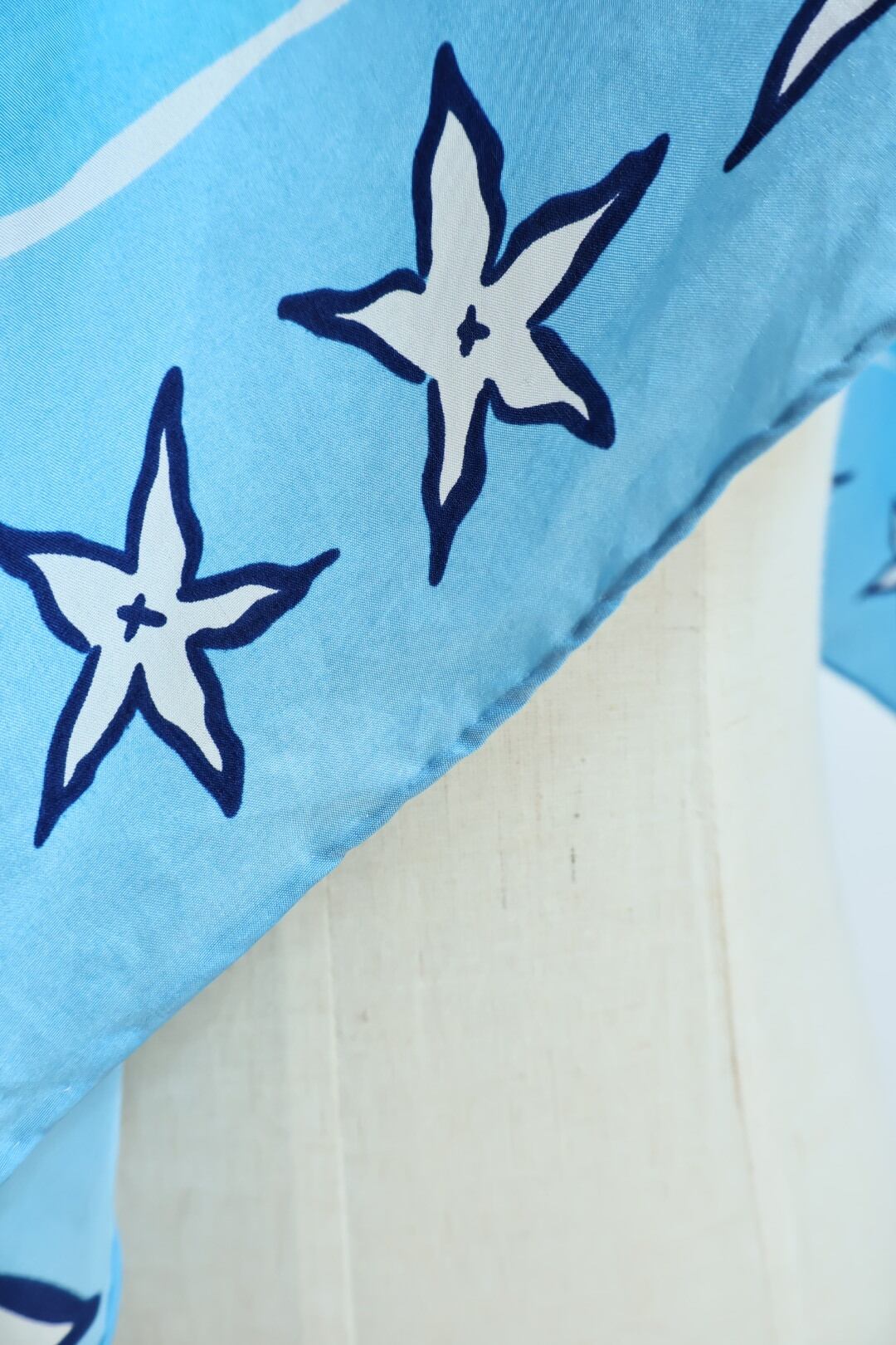 海を思わせる鮮やかなブルーに、ヒトデのモチーフとフレンチレタリングが映えるヴィンテージシルクスカーフ。