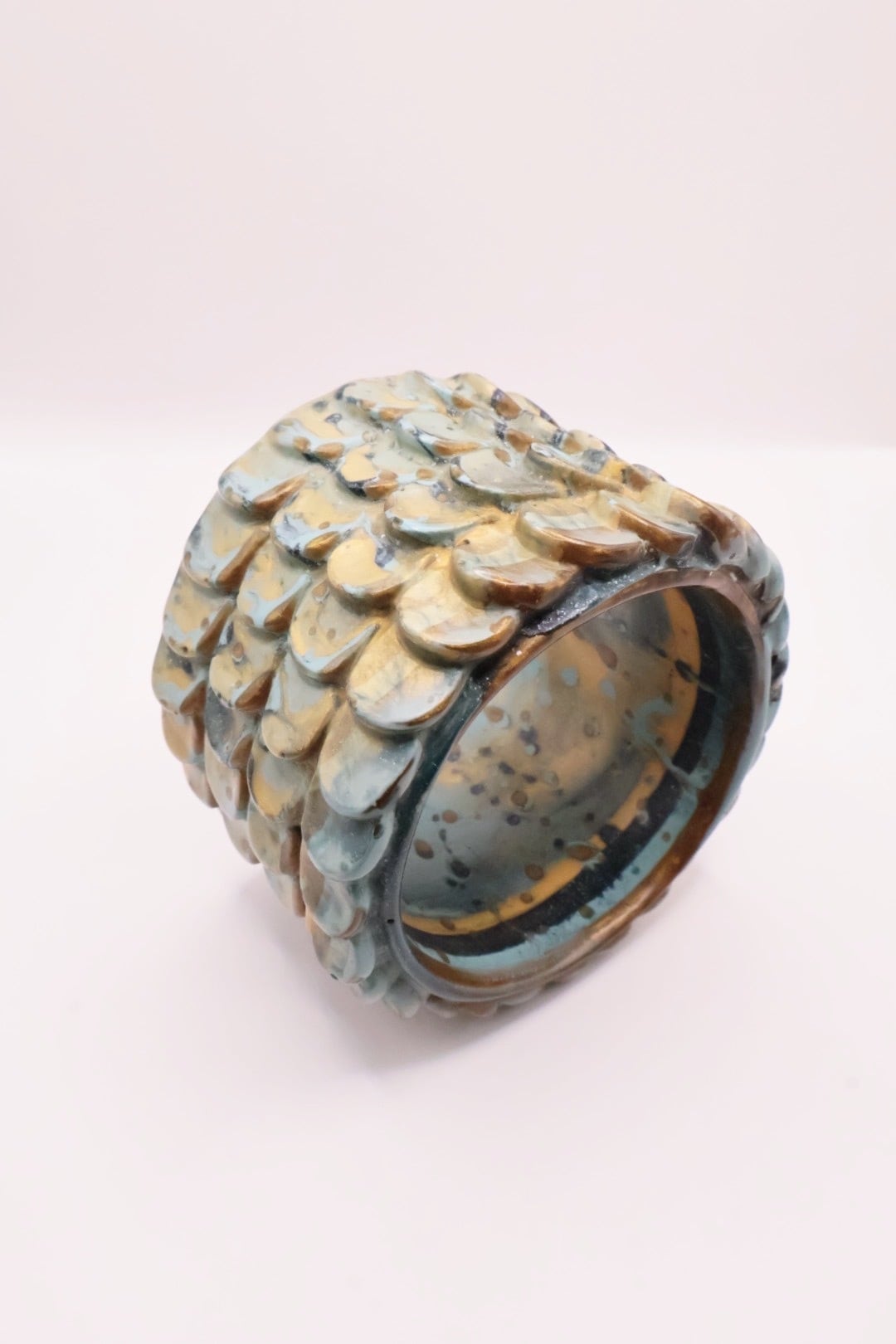 人気の「Feather(フェザー)」コレクションより。羽根やウロコのような層状のリッジが特徴の、彫刻的なレジンバングル。