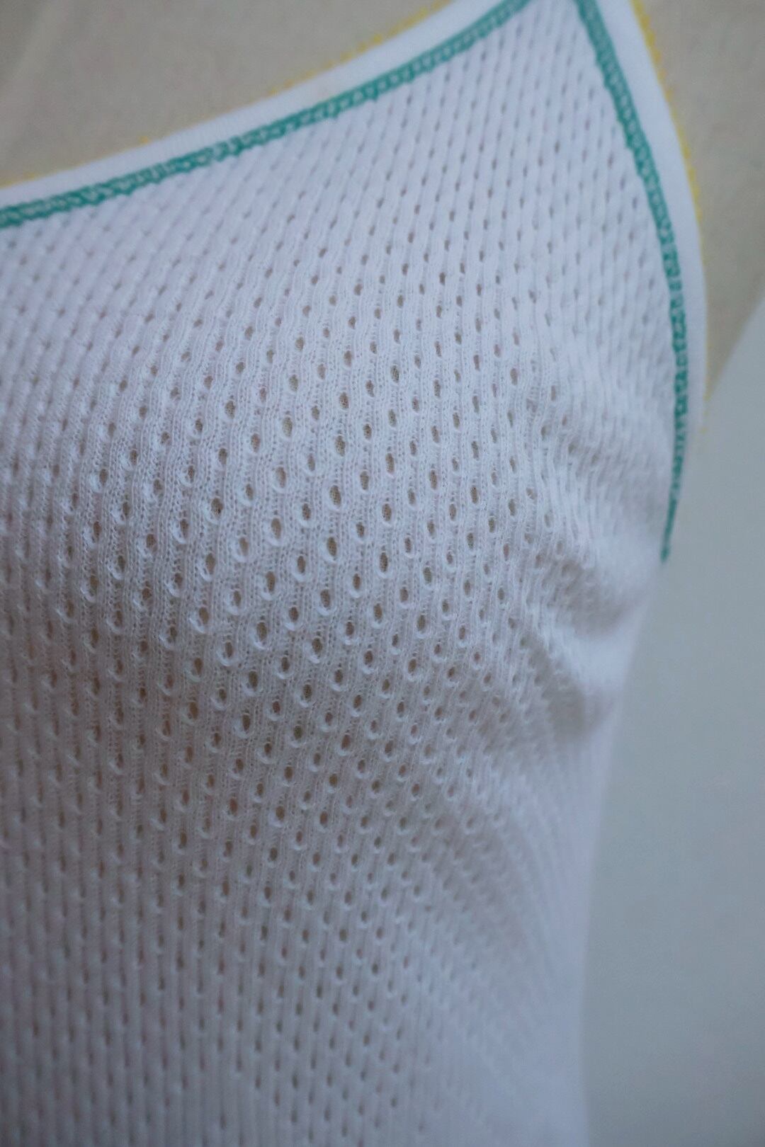 ホワイトメッシュにグリーンとイエローの柔らかいカラーが可愛い、1970s ヨーロッパヴィンテージの伸縮キャミ。