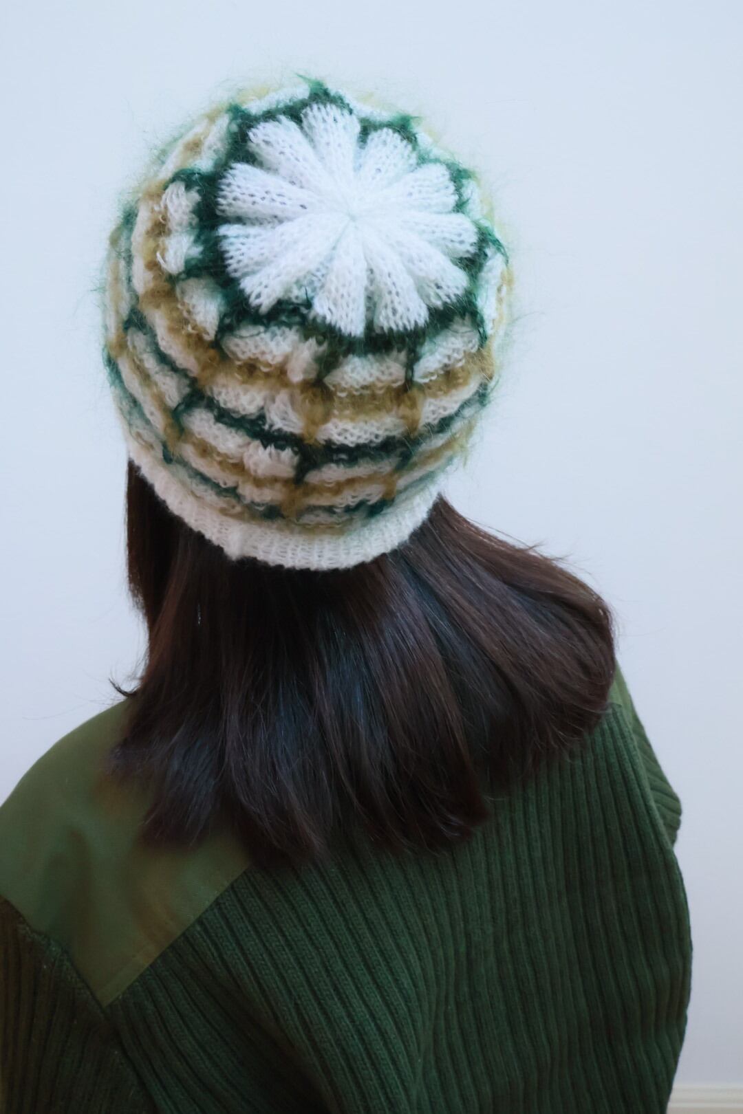 白と森の色を少し混ぜた手編みのニット帽。