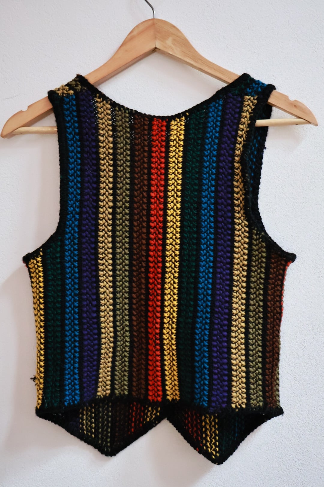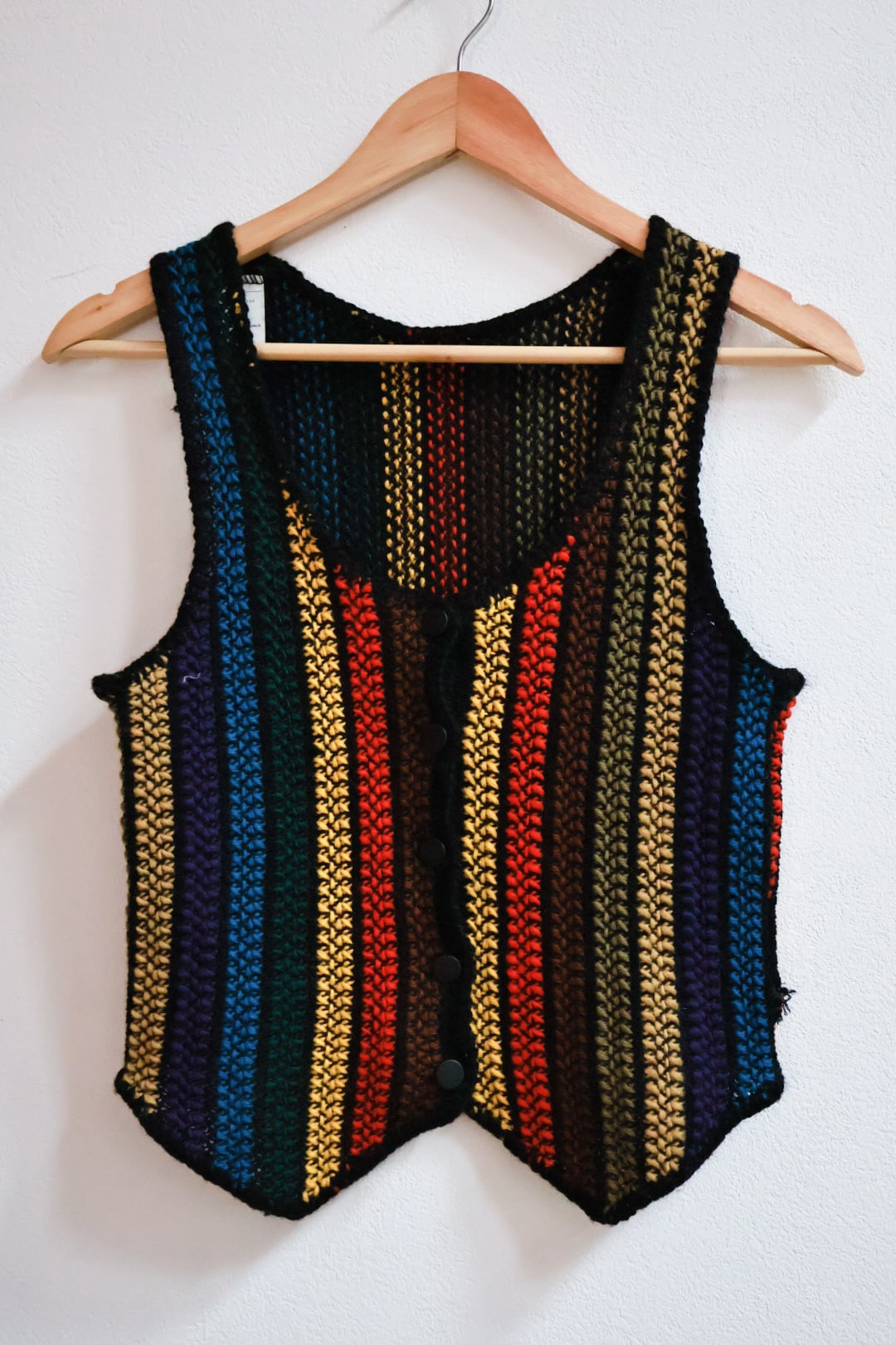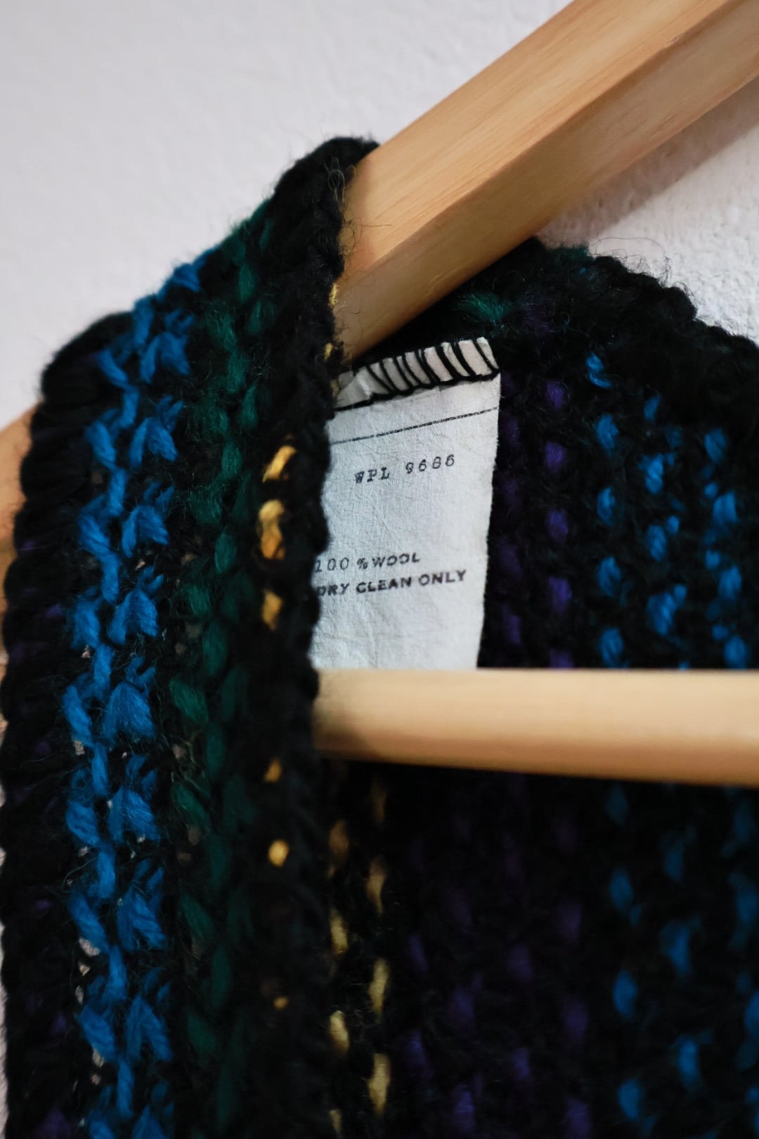 色の重なりが楽しい、存在感のあるニットベスト。落ち着いたトーンを軸にしながらも、さりげなく効いたマルチカラーのストライプが装いにリズムを添えてくれます。コンパクトなシルエットで取り入れやすく、シンプルなコーディネートのアクセントとしてもおすすめです。
