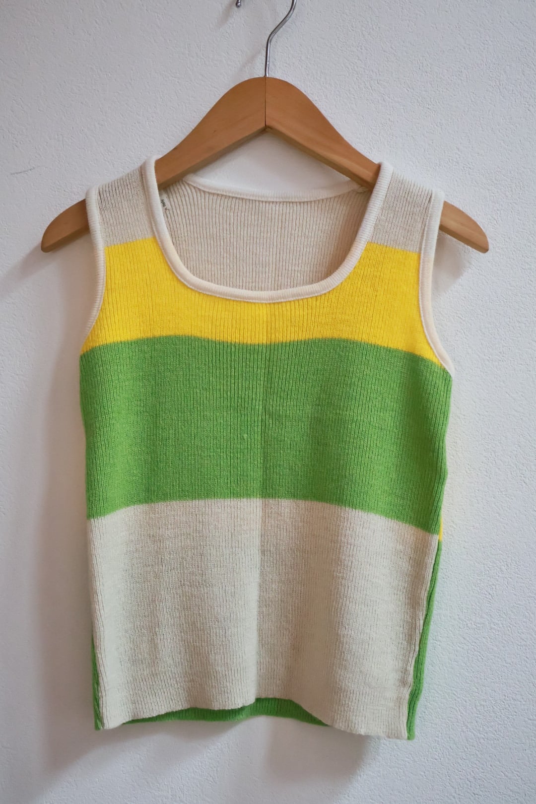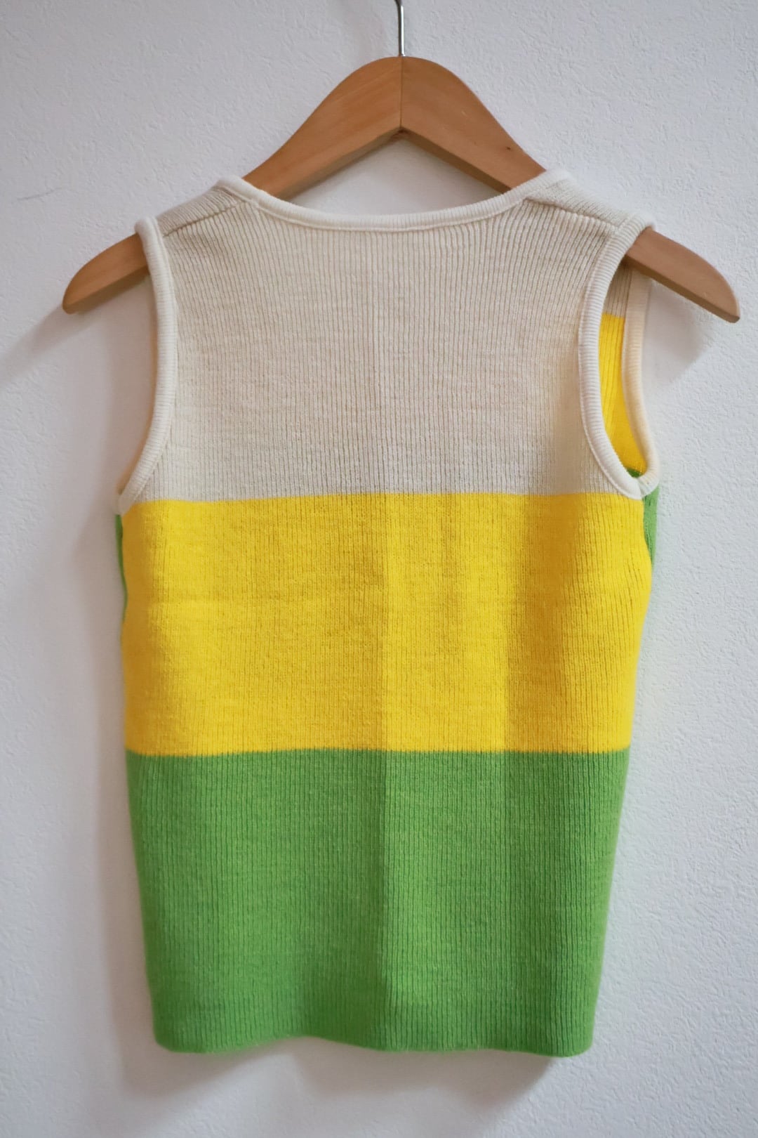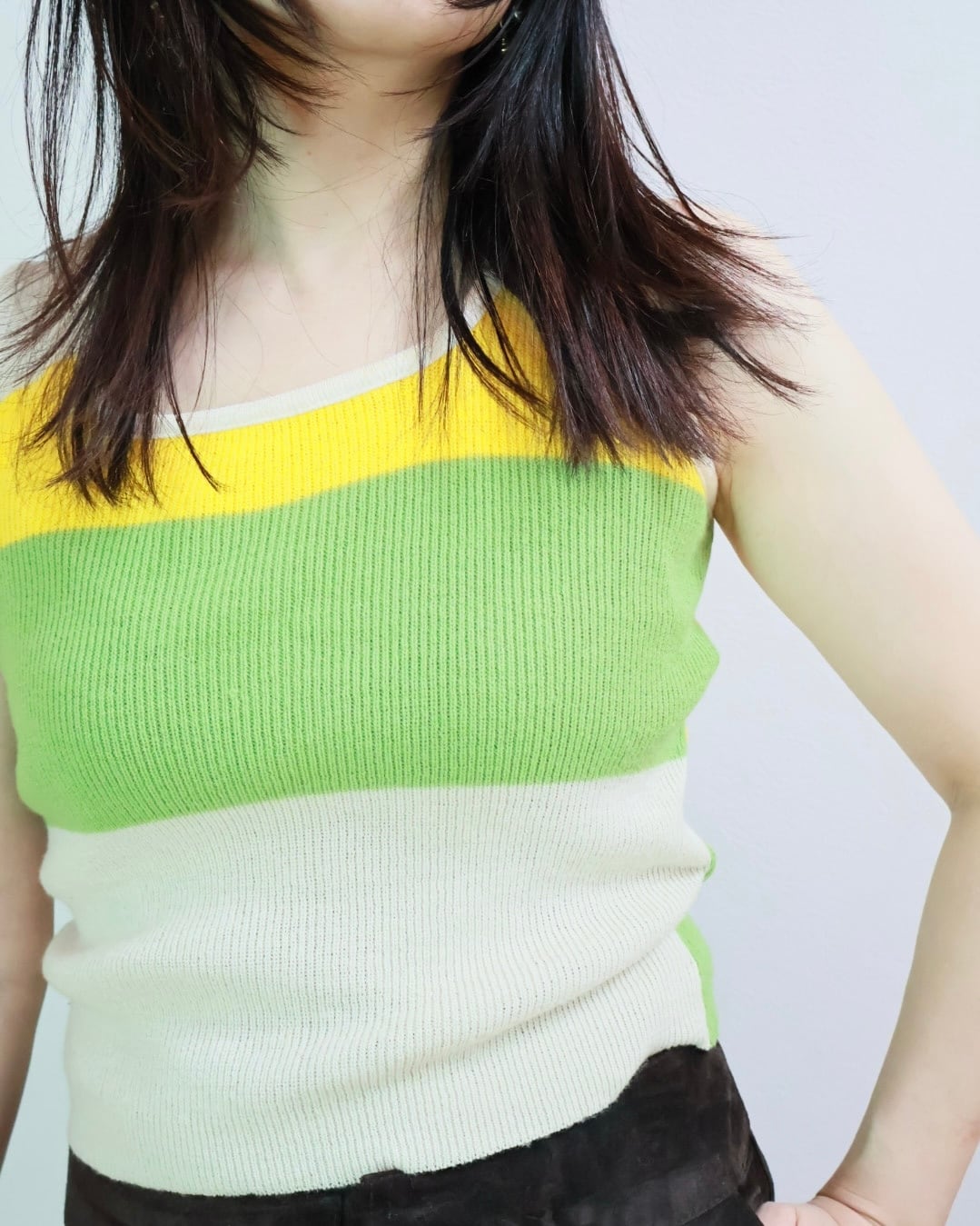 明るく軽やかな色の重なりが印象的なニットタンク。ライムグリーン、バターイエロー、アイボリーのやさしいコントラストが、どこか70sの空気を感じさせます。コンパクトですっきりとしたシルエットなので、甘くなりすぎず、スタイリングにほどよいアクセントを加えてくれます。