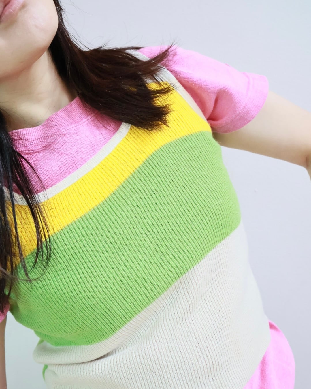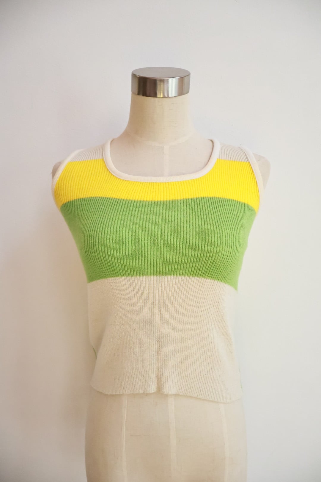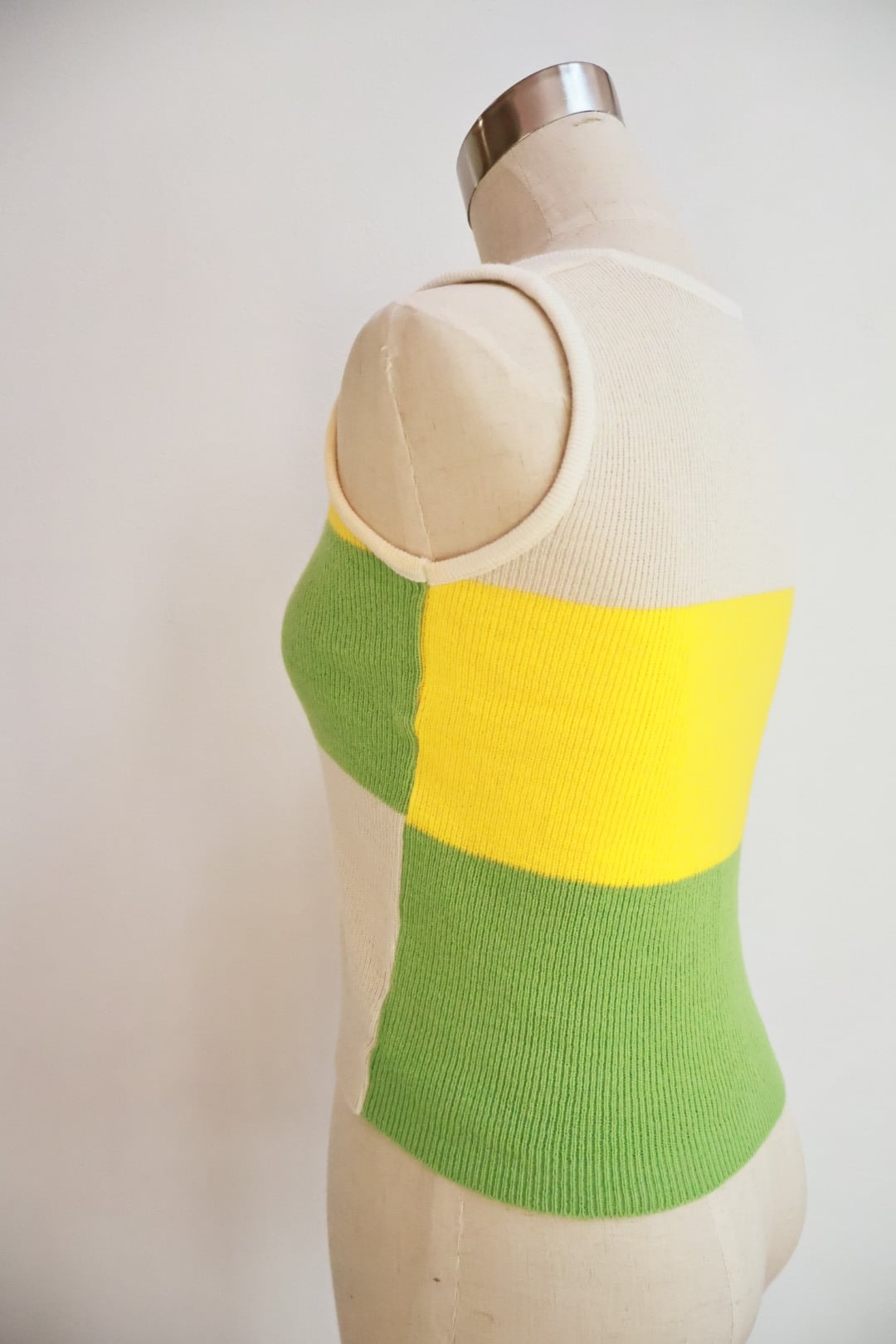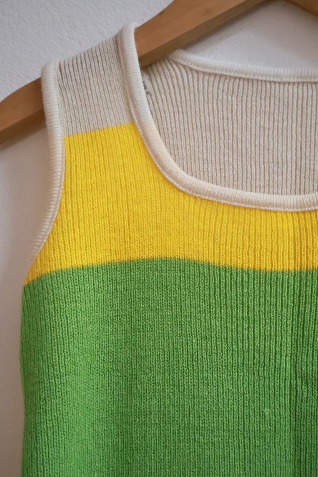 明るく軽やかな色の重なりが印象的なニットタンク。ライムグリーン、バターイエロー、アイボリーのやさしいコントラストが、どこか70sの空気を感じさせます。コンパクトですっきりとしたシルエットなので、甘くなりすぎず、スタイリングにほどよいアクセントを加えてくれます。
