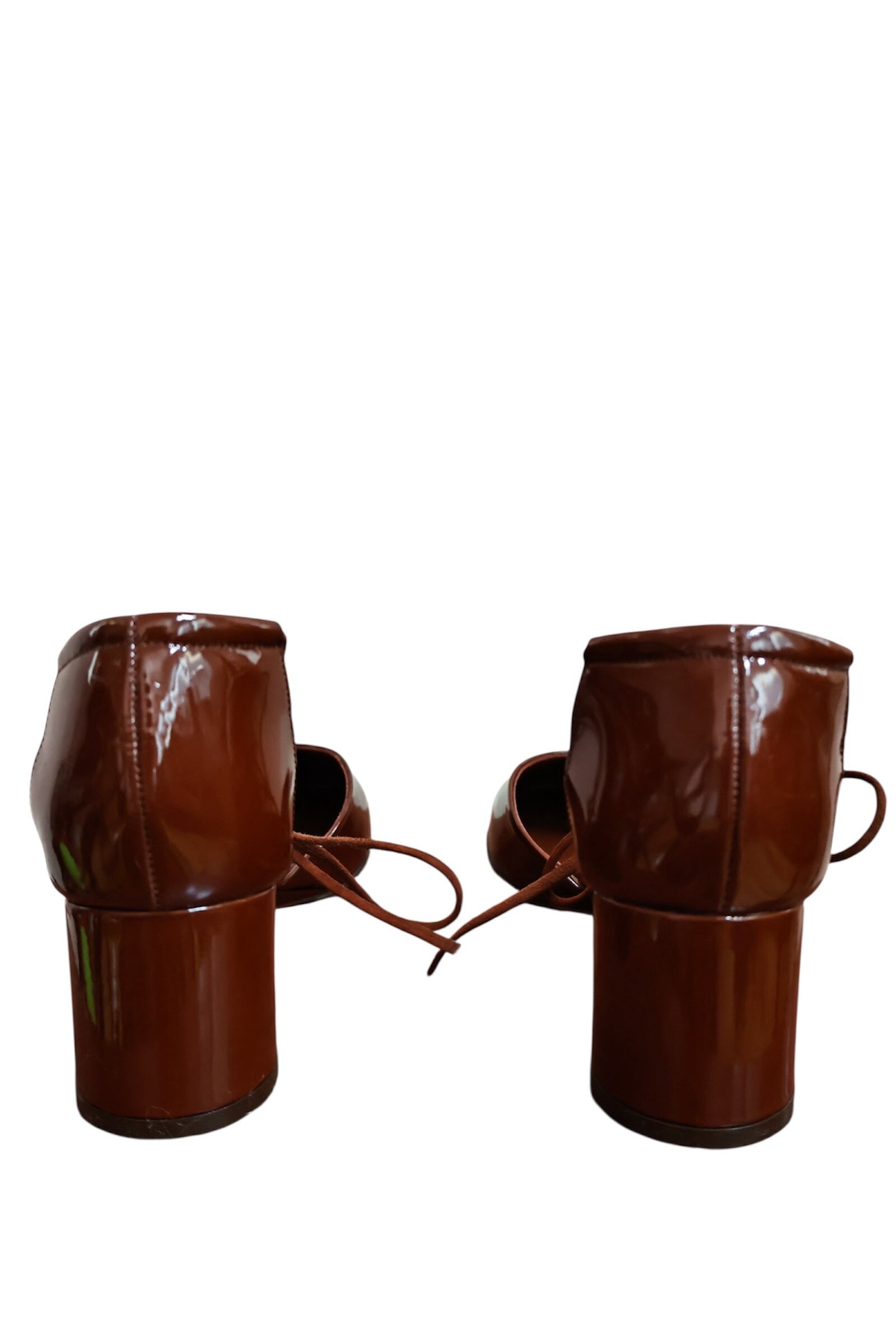 ラウンドトゥにチョコレートカラーのパテントレザー。インソールまで同色。ストラップはレザーのヒモなので柔らかく足首を痛めません。